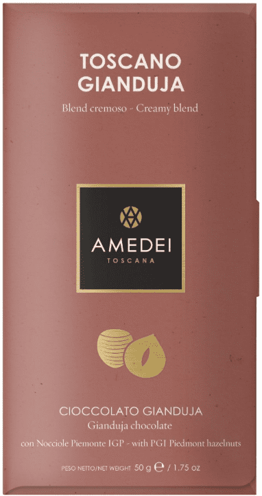 Toscano Gianduja is Amedei’s take on the classic Piedmont hazelnut chocolate. It blends fine cocoa beans with whole milk from Brittany and roasted Piedmont Hazelnuts (Tonda Gentile Trilobata), finely ground into a silky, creamy gianduja.